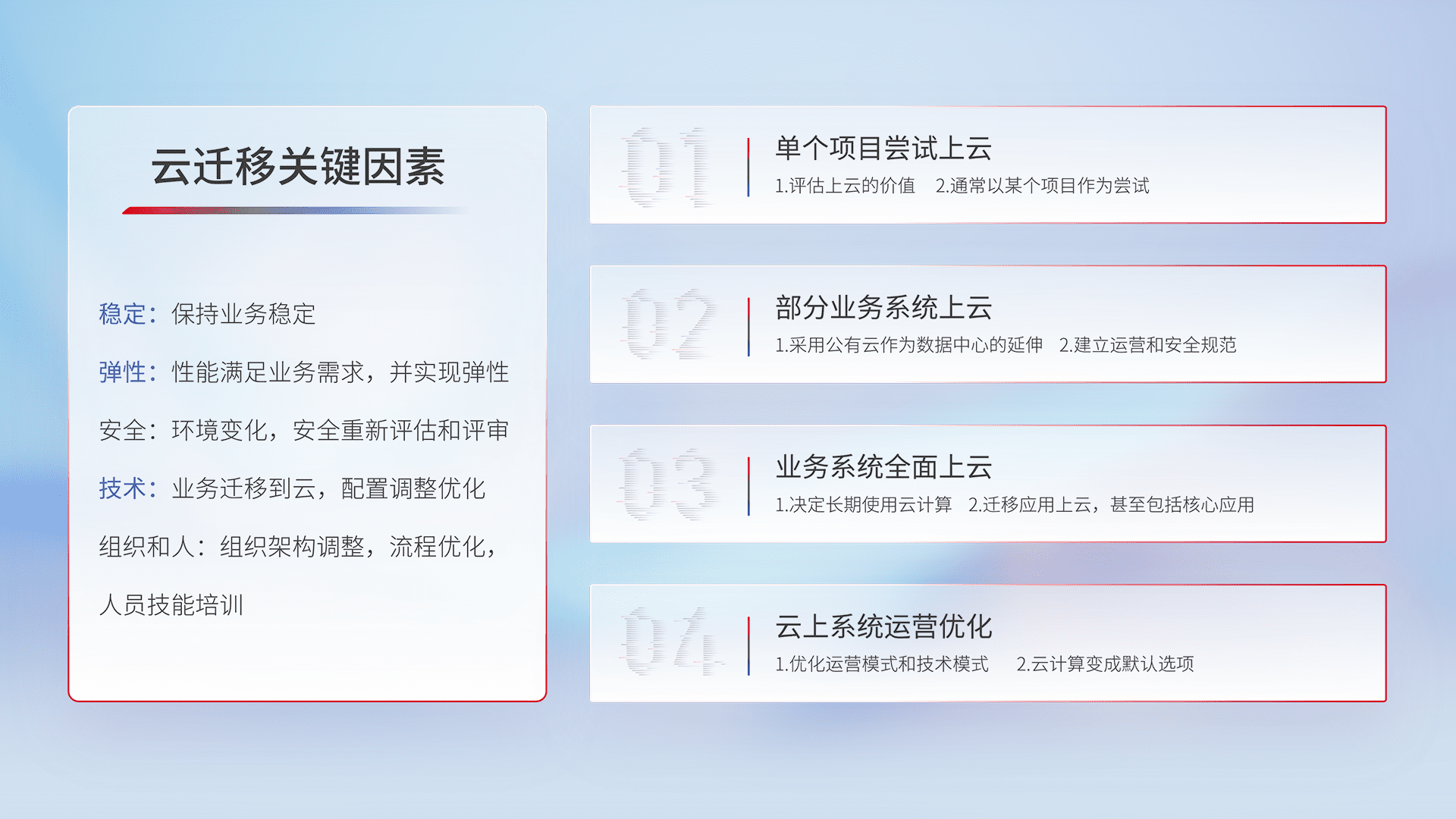 结合实际业务,,,从规划设计、、云平台选型、、、、云原生改造、、、、数据迁移、、集成交付,,,,迁移全过程为客户识别最佳上云路径,,做好风险识别管理,,,设计网络架构、、身份权限、、、、安全审计合规、、、、操作审计、、日志审计、、、、监控告警策略、、多站点容灾设计等,,,,对云上基础设施进行整体规划,,,,提升IT治理水平,,,以满足弹性、、高可用、、、、高性能的需求。。