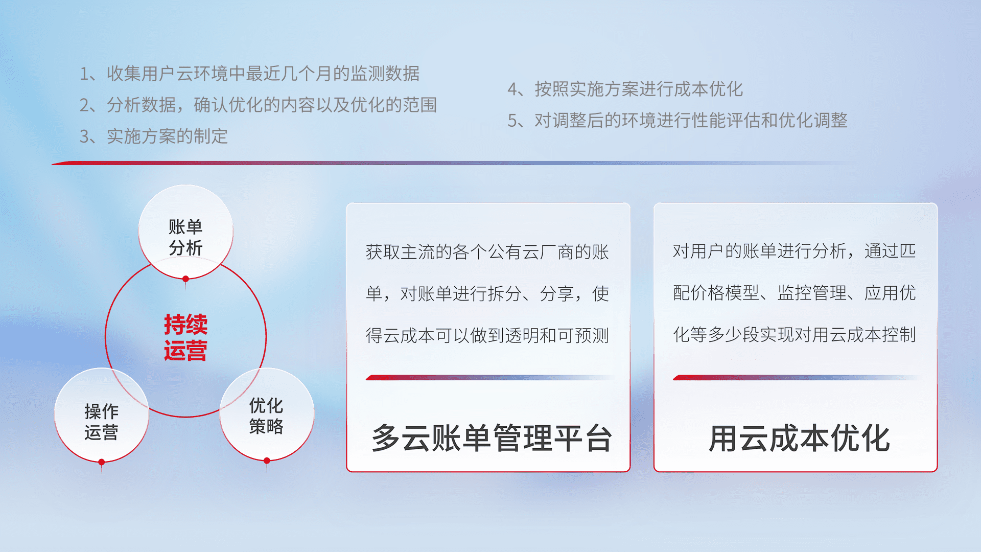 通过多云纳管,,,,以统一的资源数据模型把客户的云资源进行抽象和封装,,,,进而实现对多云资源的统一操作,,保障云资源管理的可靠性、、稳定性与可用性。。。。量身定制化运维内容,,配置、、、、开发运维、、、补丁管理、、、、备份、、监控、、、认证和访问管理、、、、审计和日常巡检等,,,保障在用云过程中的可靠度,,,,稳定度以及高可用率。。。